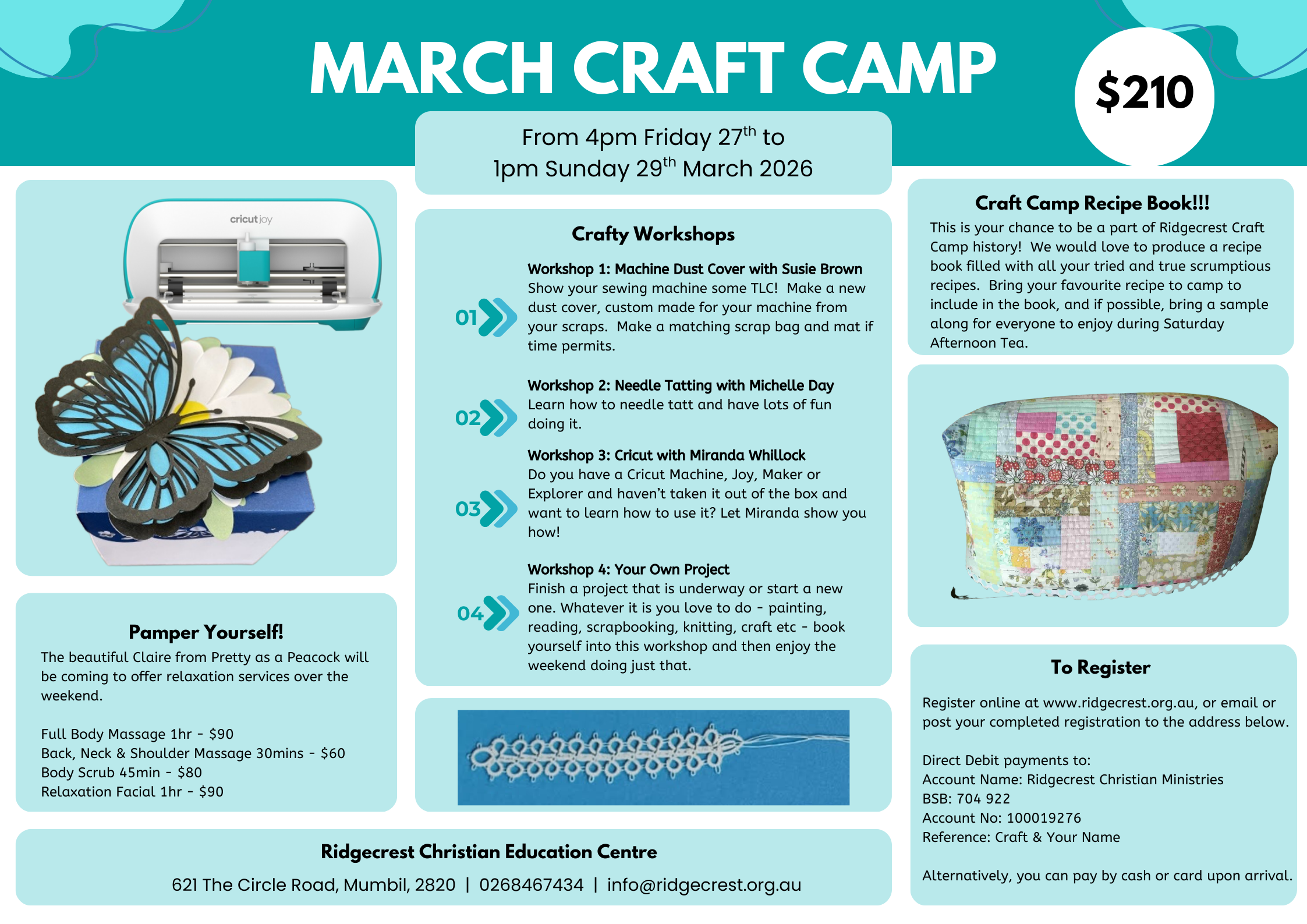 At Craft Camp you can be as busy or as relaxed as you please. Bring your own projects or see what’s being created at some of our workshops. Workshops for our March 2026 camp include: