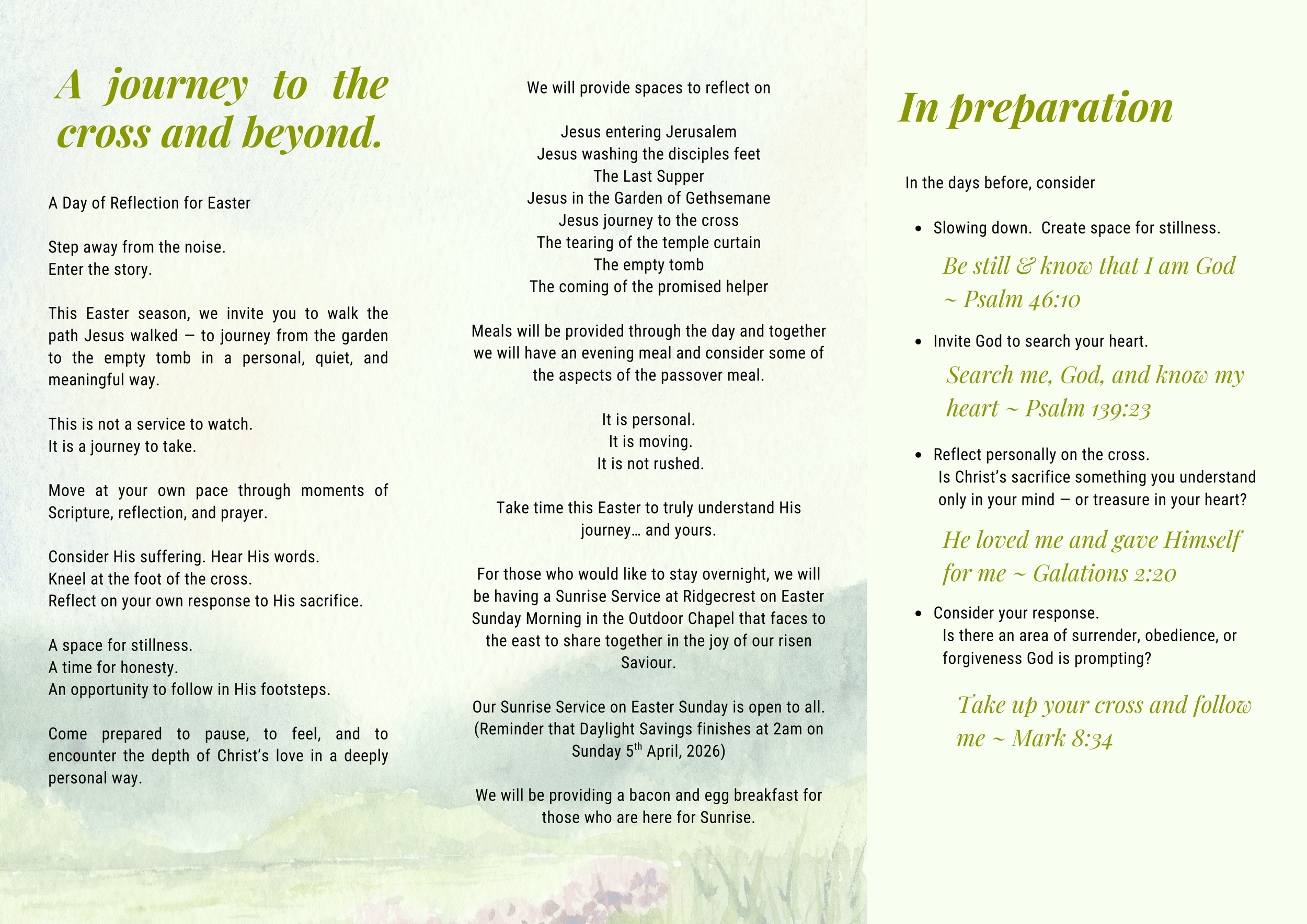 You’ll have space to consider what Christ’s suffering truly means — not just historically, but personally. To reflect on His words, His sacrifice, and your response to His love.